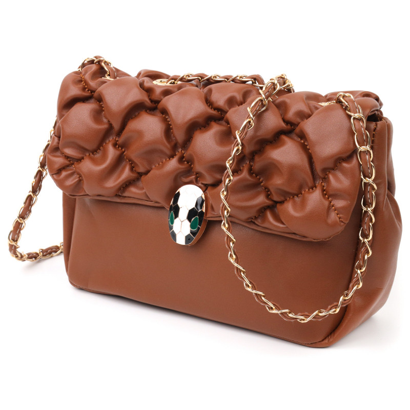 Прекрасная сумка горизонтального типа в классическом коричневом цвете, из стеганной экокожи. Сумка имеет стильный дизайн и необычную металлическую пряжку в виде головы рептилии. Аксессуар выглядит презентабельно и подойдет как под вечерний, так и повседневный образ. Фурнитура в сумке золотого цвета, ремень – сочетание цепочки и эко-кожи. Модель долгое время остается в идеальном состоянии, такую сумку приятно носить. Может быть отличным вариантом для подарка близкому человеку.