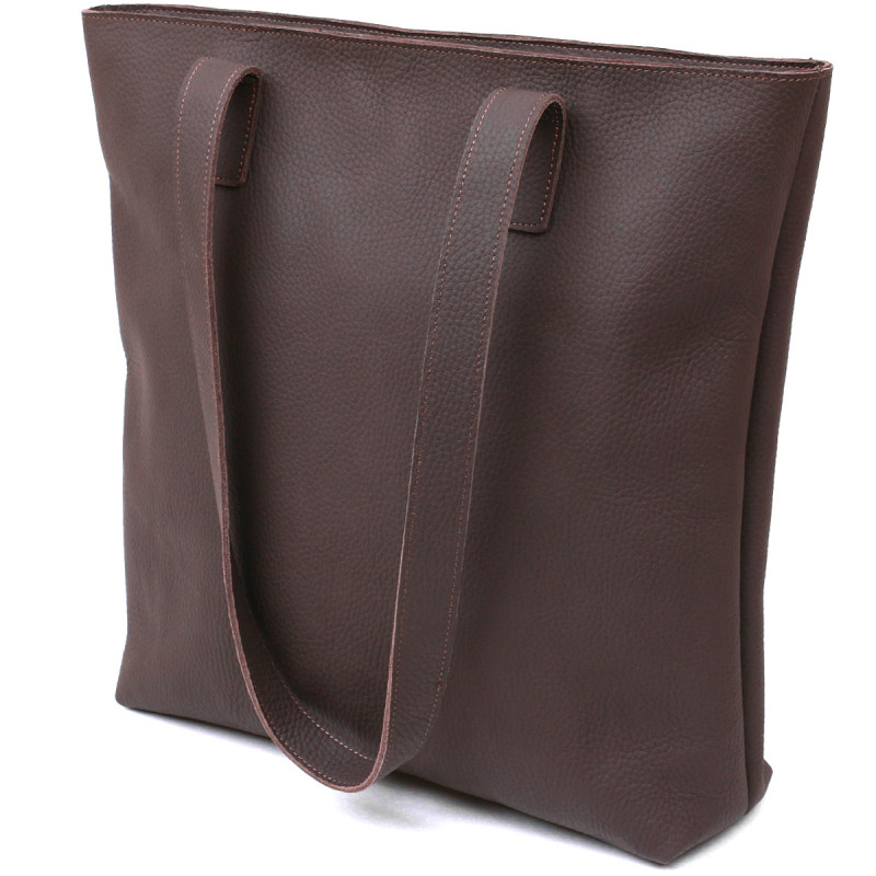 Превосходная сумка для женщин, которые отдают предпочтение просторным и вместительным аксессуарам. Цвет данной модели – матовый коричневый, фактура – зернистая и очень приятная на ощупь. Выполнена сумка из высококачественной натуральной кожи с отменными характеристиками. Основное отделение закрывается на молнию. На внешней стороне присутствует небольшой карман на молнии для быстрого доступа к его содержимому.