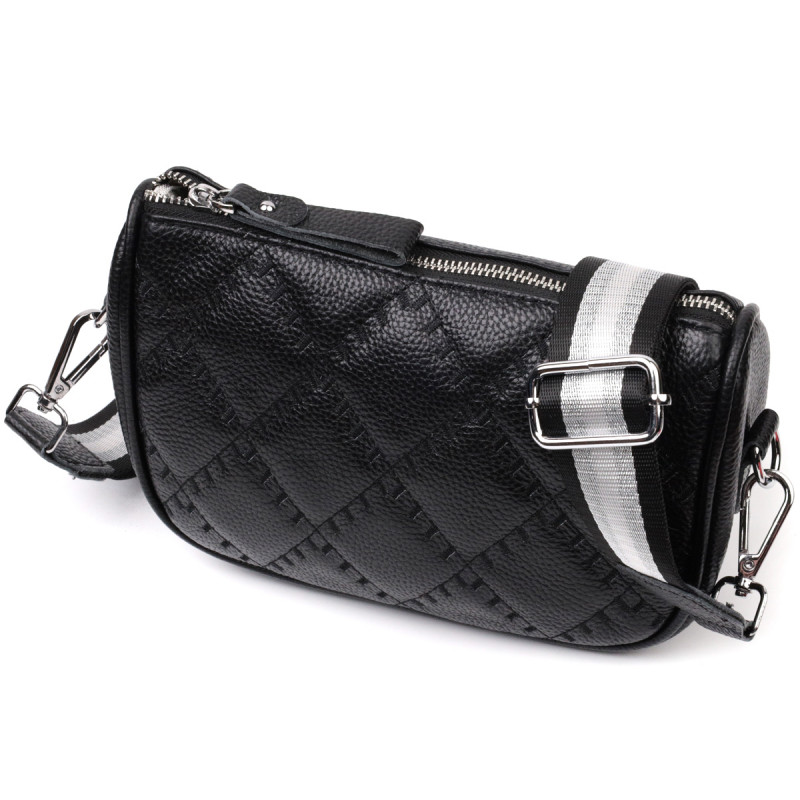 Полукруглая женская стеганая сумка из качественной натуральной кожи, которая долго носится и не теряет свой первоначальный вид. Аксессуар состоит из одного основного отделения, внутри которого расположен карман открытого типа и карман на молнии, а также карман на молнии снаружи, на тыльной стороне. Носить сумку можно в руке как клатч, на плече и через плечо, для этого имеется текстильный съемный ремень. В изделии использована качественная фурнитура серебряного цвета.