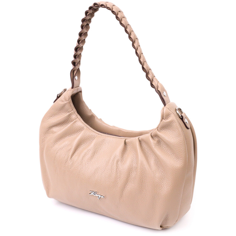 Необычная сумка багет среднего размера из натуральной крупнозернистой кожи бежевого цвета. Изделие имеет надежную плетенную ручку для переноса в руке, а также кожаный съемный и регулируемый по длине, плечевой ремень. Сумка функциональна и удобна в эксплуатации, изделие имеет качественную фурнитуру серебристого цвета и прочную подкладку. Аксессуар упакован в фирменный текстильный мешок Karya. Сумка из натуральной кожи всегда будет отличным подарком любой женщине.