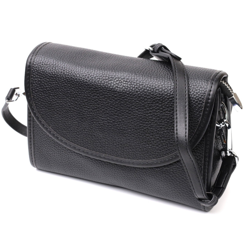 Компактная сумочка в черном цвете которая закрывается на молнию и стильный полукруглый клапан на магните. Изделие пошито из качественной натуральной мягкой кожи, которая долго носится и не теряет свой первоначальный вид. Аксессуар состоит из основного отделения и потайного кармана на молнии. Носить сумку можно под рукой, на плече и через плечо, для этого имеется кожаный съемный регулируемый ремень. В изделии использована качественная фурнитура серебряного цвета. Универсальный вариант сумки который подойдет для вечера, а также отлично подойдет на каждый день.