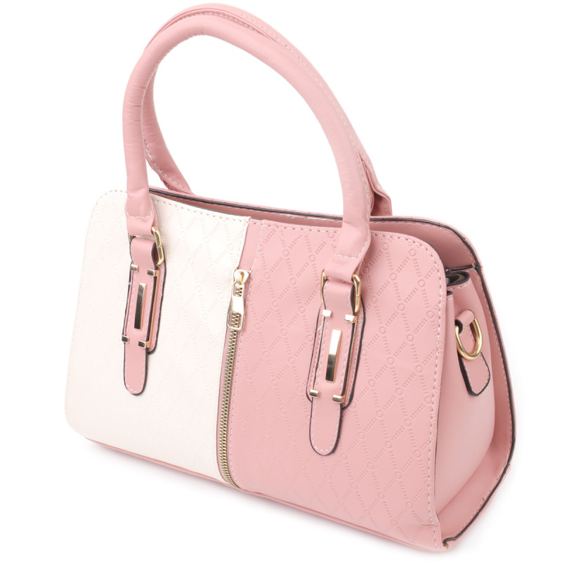 Дизайн: Интересное цветовое сочетание нежно-розового и кремово-молочного оттенков с изящной декоративной строчкой. Золотистая фурнитура и вертикальная молния спереди придают изысканный акцент.