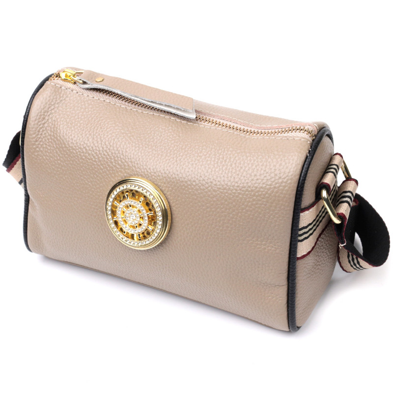 Сумка для стильных женщин из натуральной кожи с высоким показателем качества и износостойкости. На лицевой стороне расположено круглое украшение с камушками, что придает сумке стильного и изысканного вида. Аксессуар состоит из одного основного отделения, потайного кармана на молнии, кармана открытого типа и кармана на молнии снаружи. Носить сумку можно на плече и через плечо, для этого имеется текстильный не съемный ремень. В изделии использована качественная фурнитура цвета желтого золота. Универсальный вариант сумки как на вечер так и в качестве сумочки на каждый день.