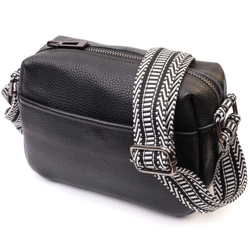Женская сумка в классическом черном цвете на все случаи из натуральной качественной кожи. Аксессуар состоит из основного отделения, которое закрывается на молнию, а также двух карманов снаружи на лицевой и тыльной стороне. Носить сумку можно в руке, под рукой, на плече и через плечо, для этого имеется текстильный не съемный ремень. В аксессуаре использована качественная фурнитура цвета темного серебра. В нашем магазине Вы сможете приобрести качественный кожаный аксессуар который всегда порадует женщину любого возраста.