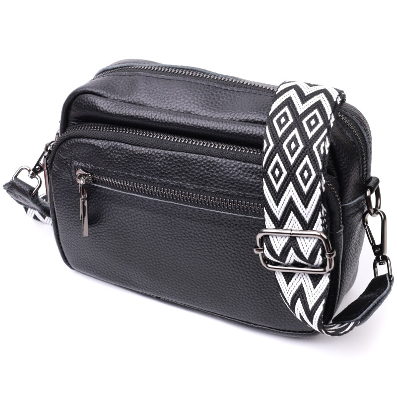 Женская компактная сумка в классическом черном цвете из натуральной кожи. Аксессуар состоит из основного отделения, что закрывается на молнию, кармана открытого типа и кармана на молнии внутри и трех карманов снаружи. Носить сумку можно на плече и через плечо, также можно носить как клатч под рукой, для этого можно снять текстильный ремешок.