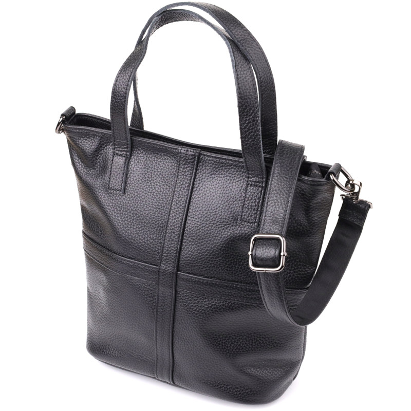 Стильная черная кожаная сумка в форме трапеции — это универсальный аксессуар, сочетающий современную элегантность и практичность. Она выполнена из натуральной кожи высокого качества, отличается плотной структурой и привлекательным лаконичным силуэтом. Сумка закрывается на молнию и имеет удобное основное отделение, внутри которого предусмотрен потайной карман на молнии, карман-перегородка на молнии и открытый карман для мелочей. Твердое дно помогает сумке сохранять форму, а фурнитура цвета темного серебра подчеркивает изысканный характер модели. Для удобства ношения предусмотрен съемный ремень, что делает сумку комфортной как в повседневных, так и в более торжественных образах.