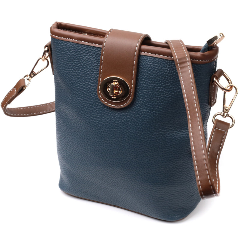 Практичная сумка удлиненной формы для стильных и независимых женщин из натуральной кожи с высоким показателем качества и износостойкости. Изделие пошито в сочетании двух цветов синего и коричневого, что придает сумке элегантного виду. Аксессуар состоит из одного основного отделения внутри которого потайной карман на молнии и карман открытого типа. Носить сумку можно на плече и через плечо, для этого имеется кожаный съемный ремень. В изделии использована качественная фурнитура цвета желтого золота. Универсальный вариант сумки как на вечер так и в качестве сумочки на каждый день.