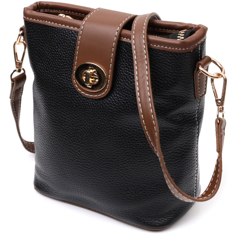 Оригинальная сумка удлиненной формы для стильных и независимых женщин из натуральной кожи с высоким показателем качества и износостойкости. Изделие пошито в сочетании двух цветов черного и коричневого, что придает сумке элегантного виду. Аксессуар состоит из одного основного отделения внутри которого потайной карман на молнии и карман открытого типа. Носить сумку можно на плече и через плечо, для этого имеется кожаный съемный ремень. В изделии использована качественная фурнитура цвета желтого золота. Универсальный вариант сумки как на вечер так и в качестве сумочки на каждый день.