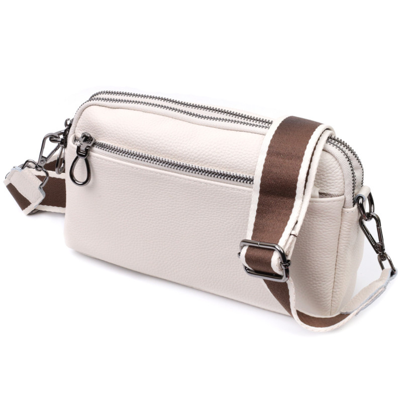 Красивая женская сумка на все случаи из натуральной кожи флотар, которая имеет зернистую фактуру. В изделии использована кожа белого цвета. Аксессуар состоит из двух отделений, которые закрываются на молнии, потайного кармана на молнии и кармана открытого типа, а также двух карманов снаружи на лицевой и тыльной стороне. Носить сумку можно в руке, под рукой, на плече и через плечо, для этого имеется текстильный съемный ремень. В аксессуаре использована качественная фурнитура цвета темного серебра. Отличный вариант для подарка близким и дорогим девушкам и женщинам.