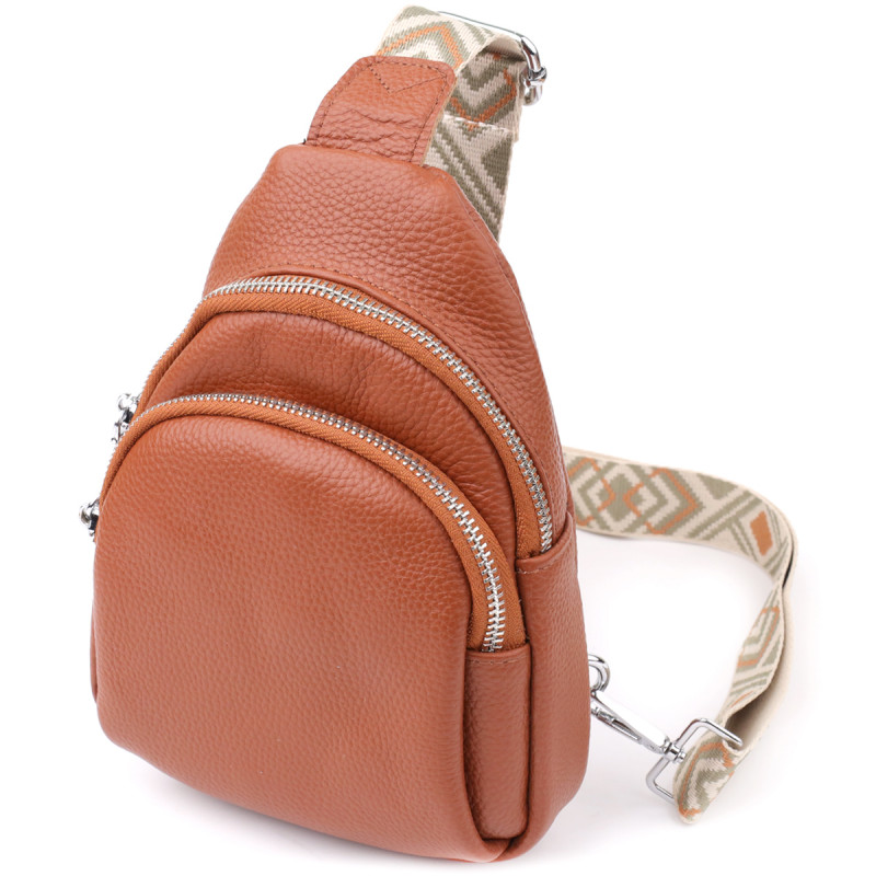 Особое внимание заслуживает регулируемый текстильный ремень с ярким стильным узором — он не только обеспечивает комфортную посадку на теле, но и становится выразительным элементом дизайна. Ремень несъёмный, но легко регулируется под ваш рост и способ ношения. Фурнитура выполнена в серебристом цвете, что придаёт аксессуару современный и сдержанный блеск, прекрасно сочетающийся с текстурой кожи и акцентами ремня.