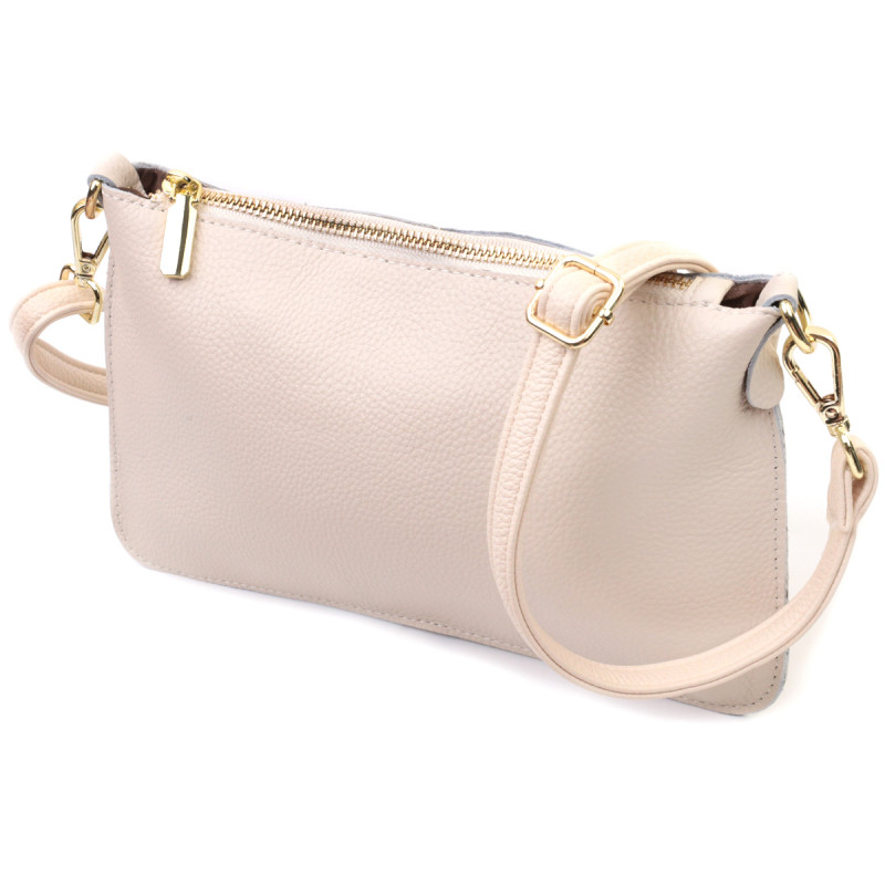 Удобная женская функциональная сумка-клатч из натуральной кожи. Аксессуар состоит из основного отделения, что закрывается на молнию, кармана-перегородки на молнии внутри и кармана на молнии на тыльной стороне, снаружи. Носить сумку можно на плече и через плечо, также можно носить как клатч под рукой и на кисти, для этого имеется длинный съемный ремешок, а также съемный кистевой ремень.