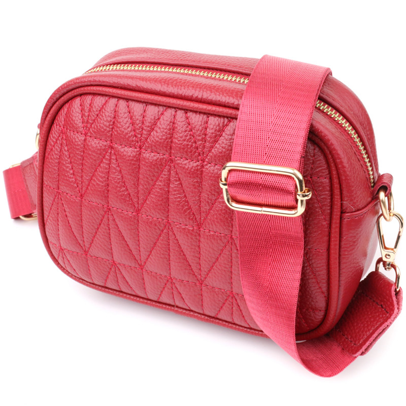 Стеганая сумка для женщин в насыщенном красном цвете из натуральной кожи станет эффектным акцентом вашего образа, добавляя яркости и харизмы. Качественная плотная кожа приятна на ощупь и подчеркивает высокий уровень исполнения. Компактная четкая форма делает модель удобной и аккуратной, а стежка на лицевой стороне придает ей утонченный дизайнерский характер. Сумка закрывается на молнию, внутри находится основное отделение с карманом на молнии и открытым карманом для мелочей, а на тыльной стороне предусмотрен внешний карман на молнии для быстрого доступа к нужным вещам. Съемный регулируемый текстильный ремень обеспечивает комфорт при носке, а фурнитура под желтое золото стильно оттеняет насыщенный красный оттенок кожи. Эта сумка станет универсальным аксессуаром для повседневных выходов и особых случаев, подчеркивая вкус и внимание к деталям.