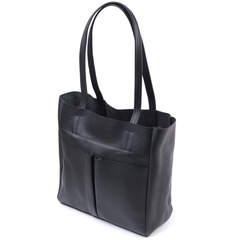Функциональная женская сумка для тех, кто всегда носит с собой огромное количество вещей. Такую сумку можно спокойно носить на работу, в нее отлично помещаются все личные вещи а также папки с документами. Также такую модель удобно брать с собой в путешествия и выглядеть всегда стильным и элегантным. Цвет модели – черный, фактура – зернистая. Материал исполнения – натуральная кожа с высокими показателями стойкости к износу. Для переноски используются две крепкие надежные ручки. Сумка имеет съемное уплотненное дно прямоугольной формы, для того, чтобы придать по желанию более четких форм аксессуару. Фурнитура серебряного цвета - стойкая не меняет свой цвет в процессе носки. Аксессуар отлично сочетается со всеми стилями в одежде и может стать отличным подарком на любой праздник.
