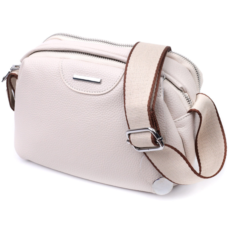 Елегантна сумка для жінок із натуральної шкіри флотар, яка має зернисту фактуру. У виробі використано шкіру білого кольору. Аксесуар складається з двох відділень, які закриваються на блискавки, потайної кишені на блискавці та кишені відкритого типу, а також кишені зовні на тильній стороні. Виріб має тверде дно, що дозволяє зберігати форму. Носити сумку можна в руці, під рукою, на плечі і через плече, для цього є текстильний ремінь, що не знімається. В аксесуарі використано якісну фурнітуру кольору срібла. Відмінний варіант для подарунка близьким та дорогим дівчатам та жінкам.