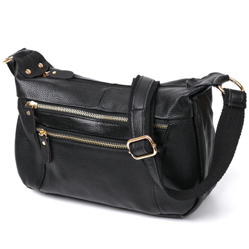 Практична жіноча сумка невеликого розміру із натуральної високоякісної шкіри із зернистою фактурою. Має універсальний чорний колір та фурнітуру під золото. Внутрішнє наповнення представлене у вигляді місткого відділення на блискавці, кишень для телефону та інших дрібних речей. На зовнішній стороні також є місткі кишені.