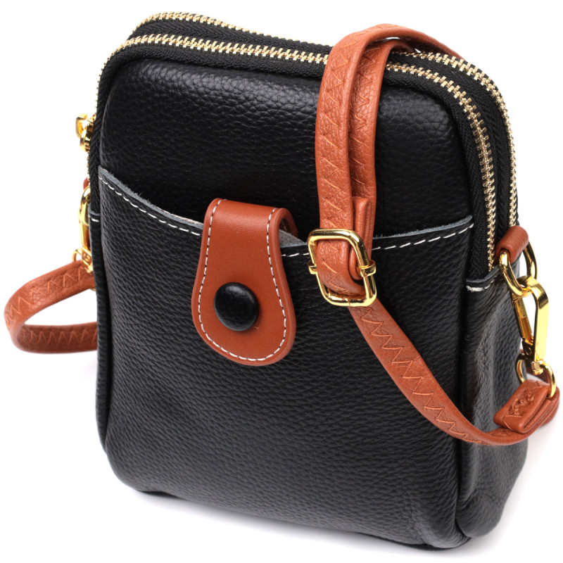Стильна сумка трапецієподібної форми для стильних та незалежних жінок з натуральної шкіри з високим показником якості та зносостійкості. На лицьовій стороні розташована накладна кишеня, що закривається хлястиком на магніт, хлястик і знімний плечовий ремінь коричневого кольору, що надає сумці стилю. Аксесуар складається з двох відділень, що закриваються на блискавки, всередині яких знаходиться потайна кишеня на блискавці та кишеня відкритого типу. Носити сумку можна на плечі і через плече, для цього є шкіряний ремінь, що знімається. У виробі використано якісну фурнітуру кольору жовтого золота. Універсальний варіант сумки як на вечір так і як сумочка на кожен день.