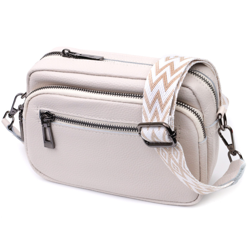Компактна жіноча сумка в красивому білому кольорі з натуральної шкіри. Аксесуар складається з основного відділення, що закривається на блискавку, кишені відкритого типу та кишені на блискавці всередині та трьох кишень зовні. Носити сумку можна на плечі та через плече, також можна носити як клатч під рукою, для цього можна зняти текстильний ремінець.